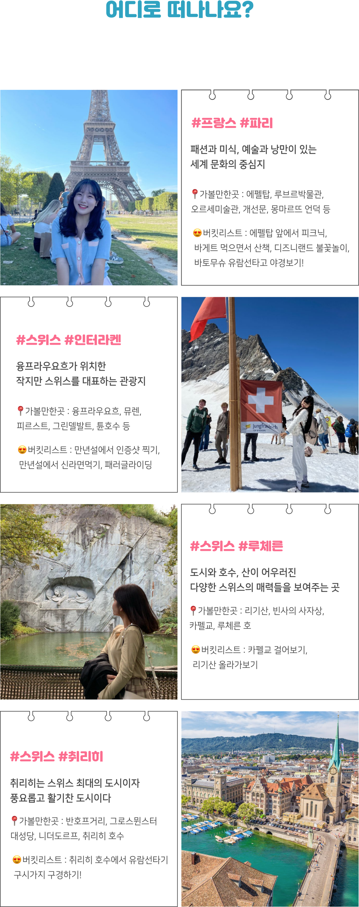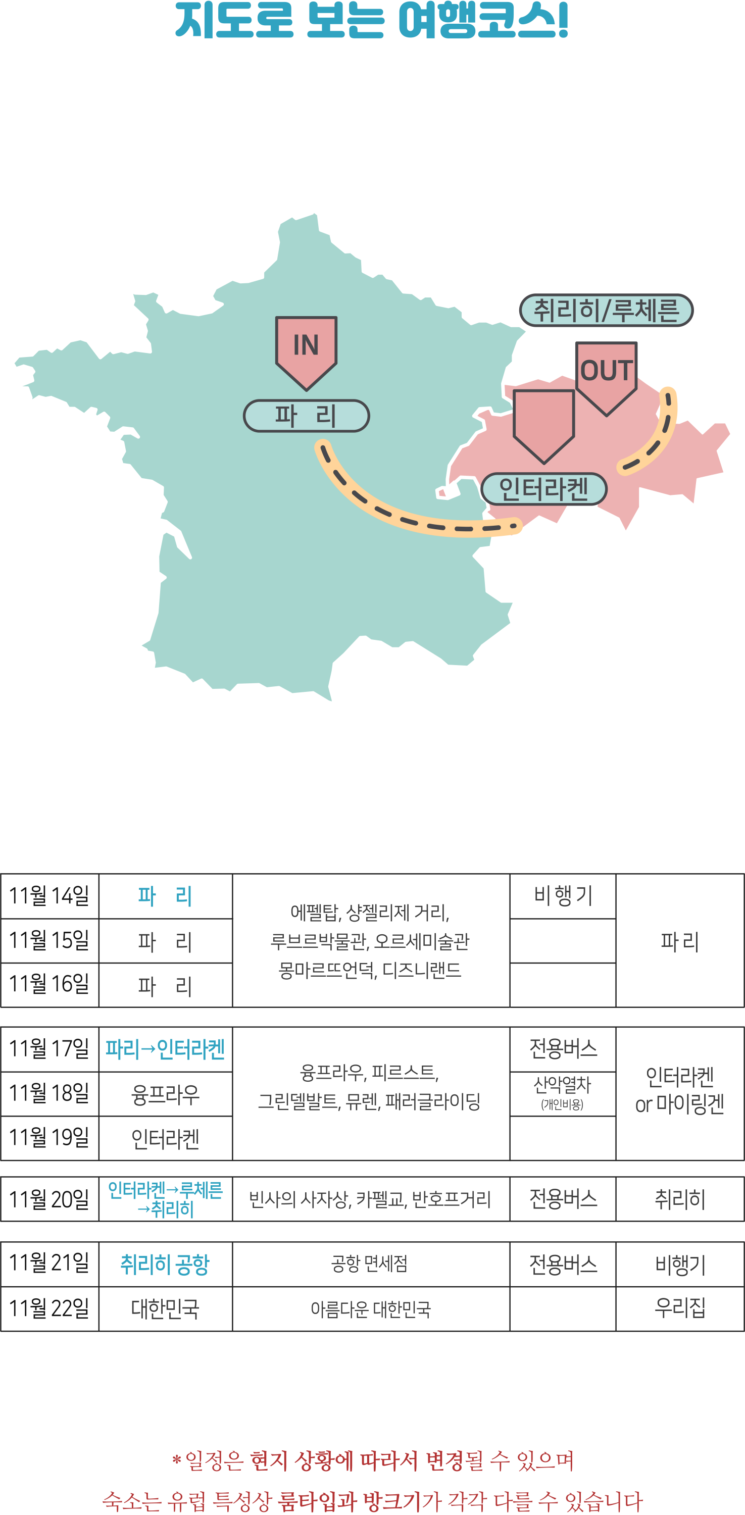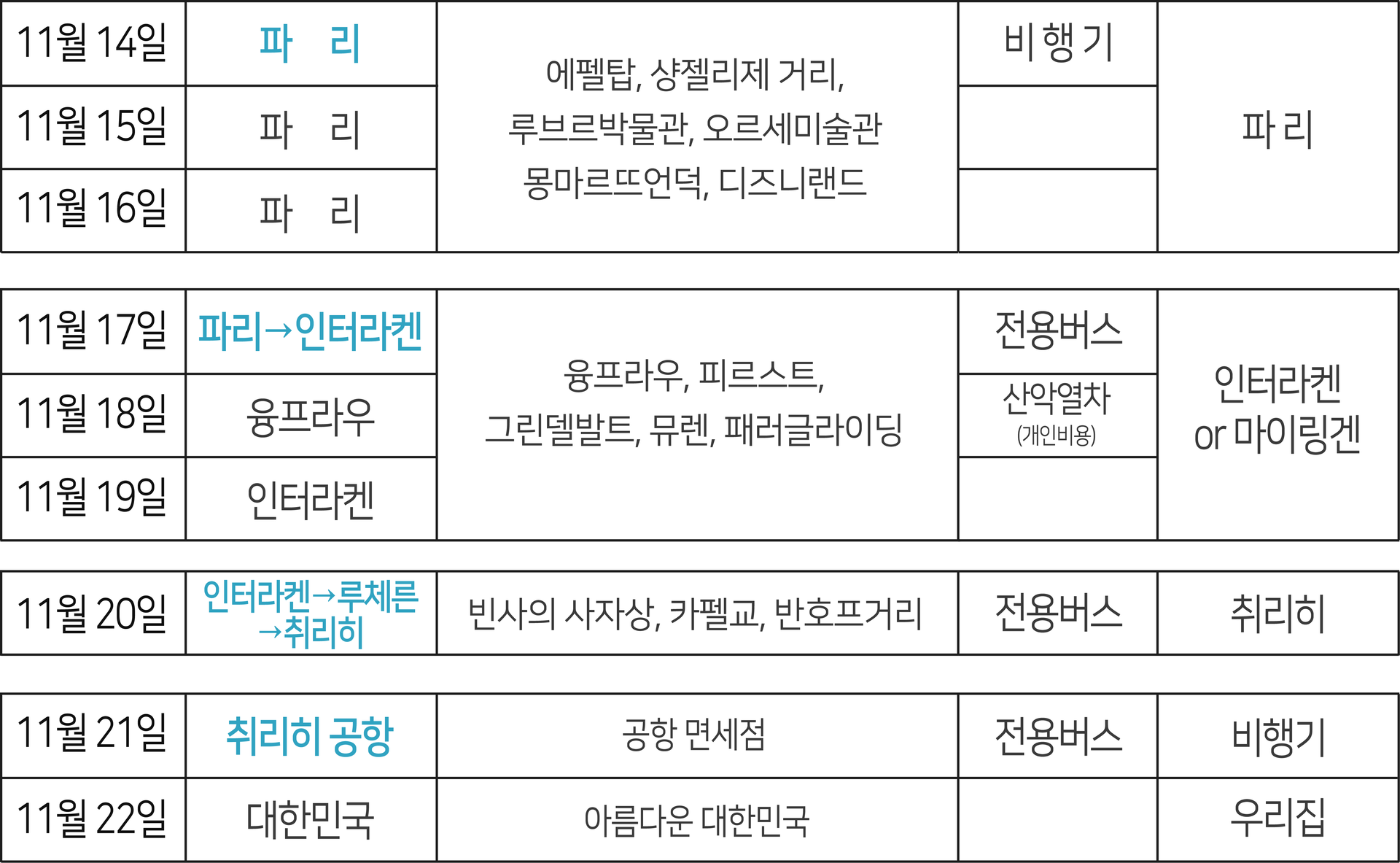 파리(3박) ▷ 인터라켄(3박) ▷ 루체른 ▷ 취리히(1박)