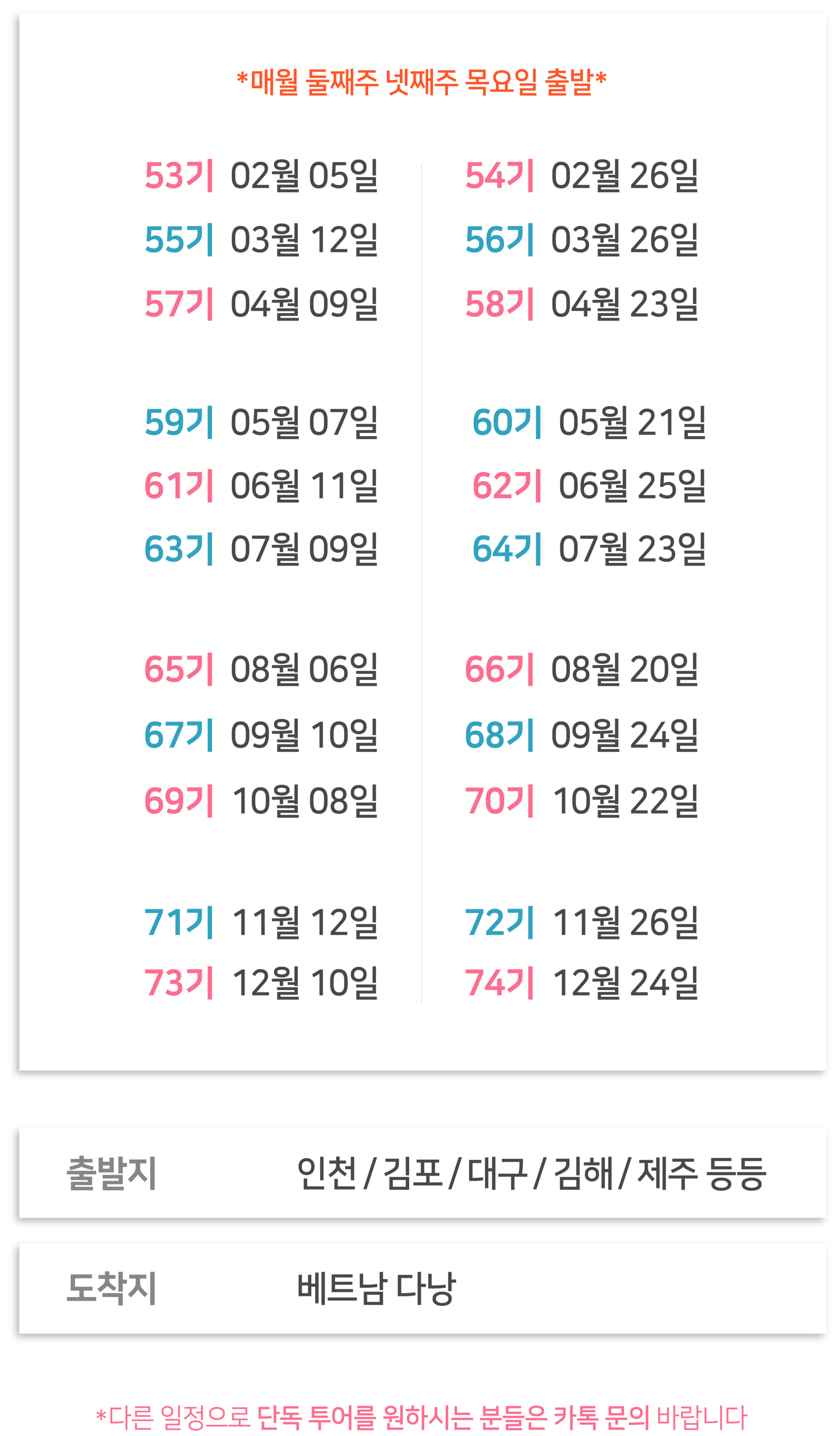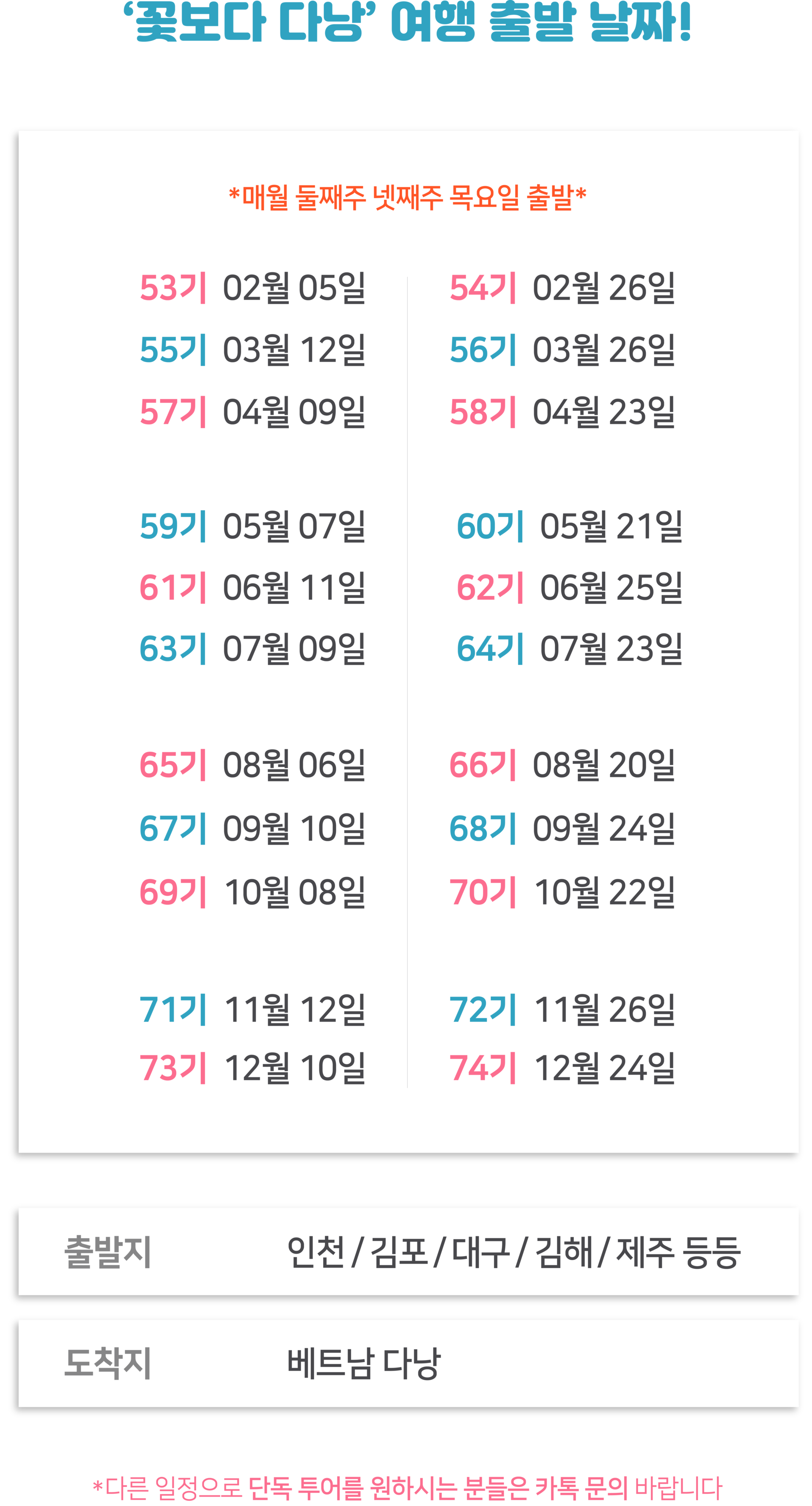 여행코스 | 다낭(1박) ▷ 호이안(1박) ▷ 남호이안(1박) 다낭 한시장/콩카페 - 오행산 - 바구니배 - 호이안 올드타운 - 빈원더스 - 바나힐 - 마사지 - 야시장 * 다른 일정으로 단독투어를 원하시는 분들은 카톡문의 |