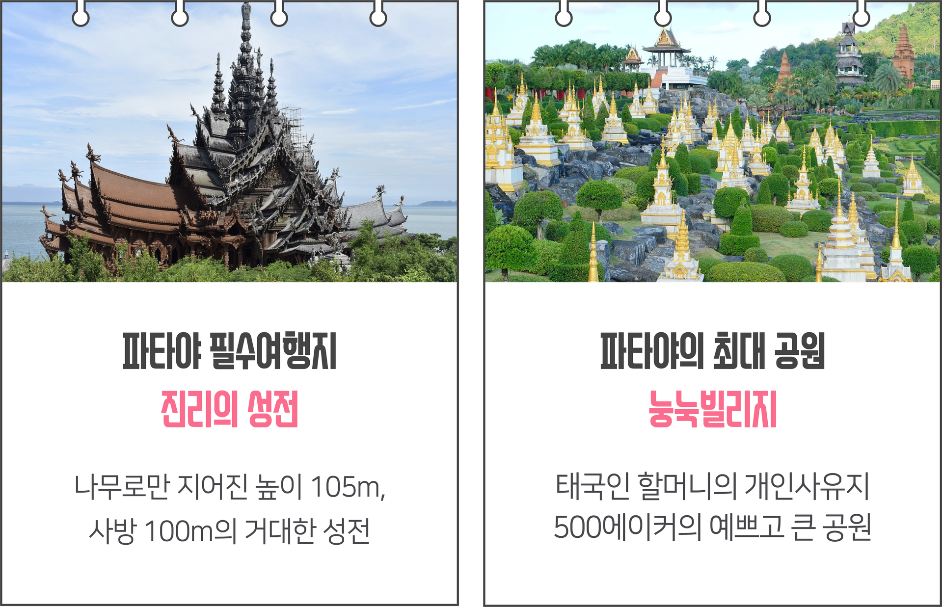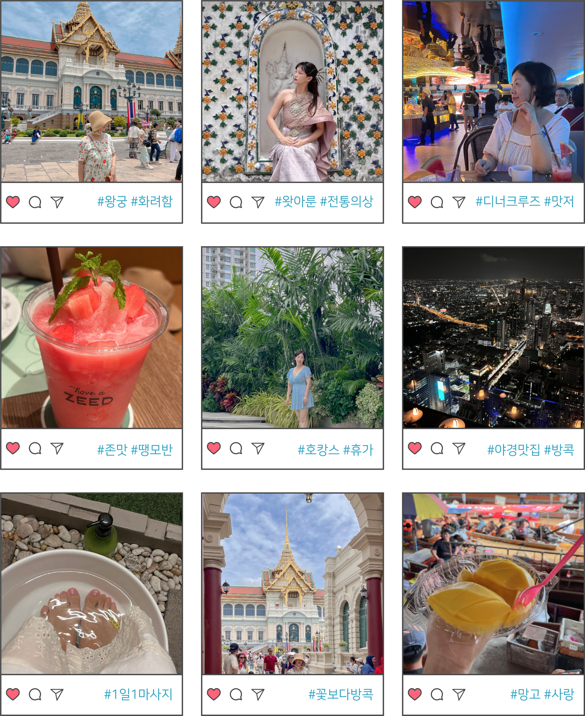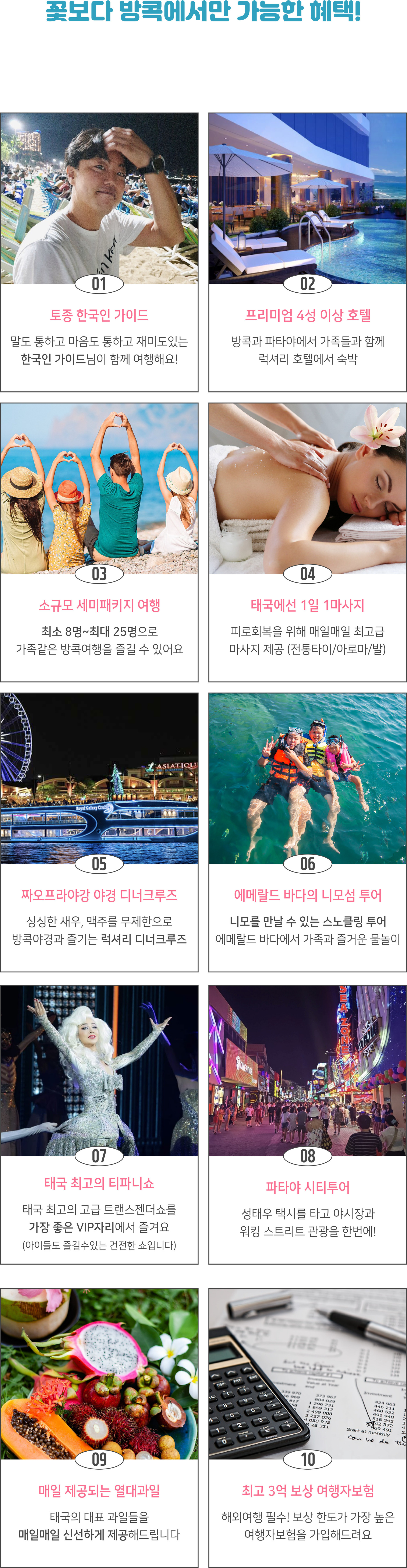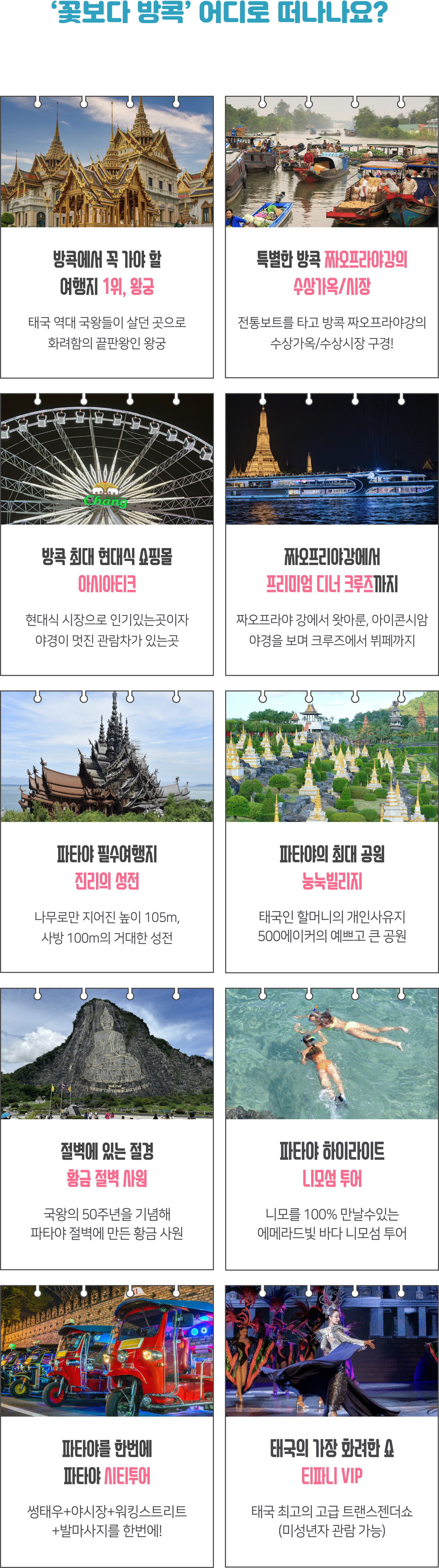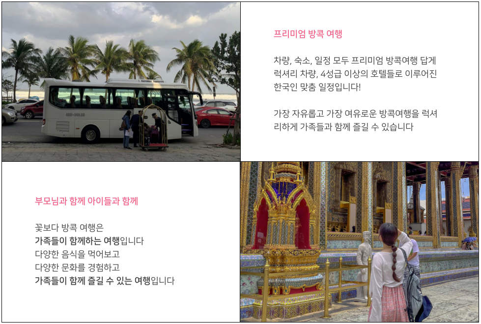 여행코스 | 방콕(1박) ▷ 파타야(2박) 왕궁, 수상마을, 진리의성전, 마사지, 티파니쇼, 야시장, 니모섬 투어, 파타야시티투어, 눙눅빌리지, 아시아티크 등 * 다른 일정으로 단독투어를 원하시는 분들은 카톡문의 |