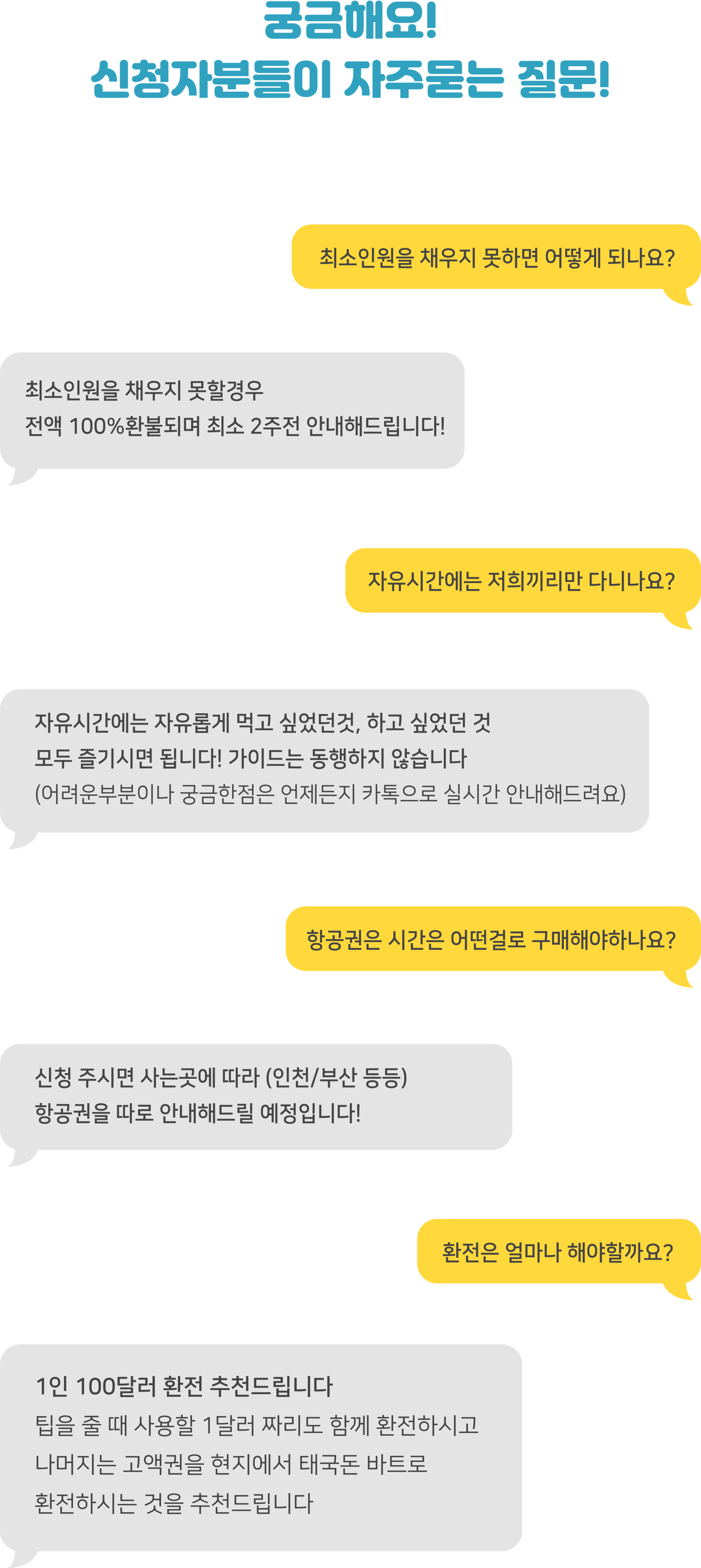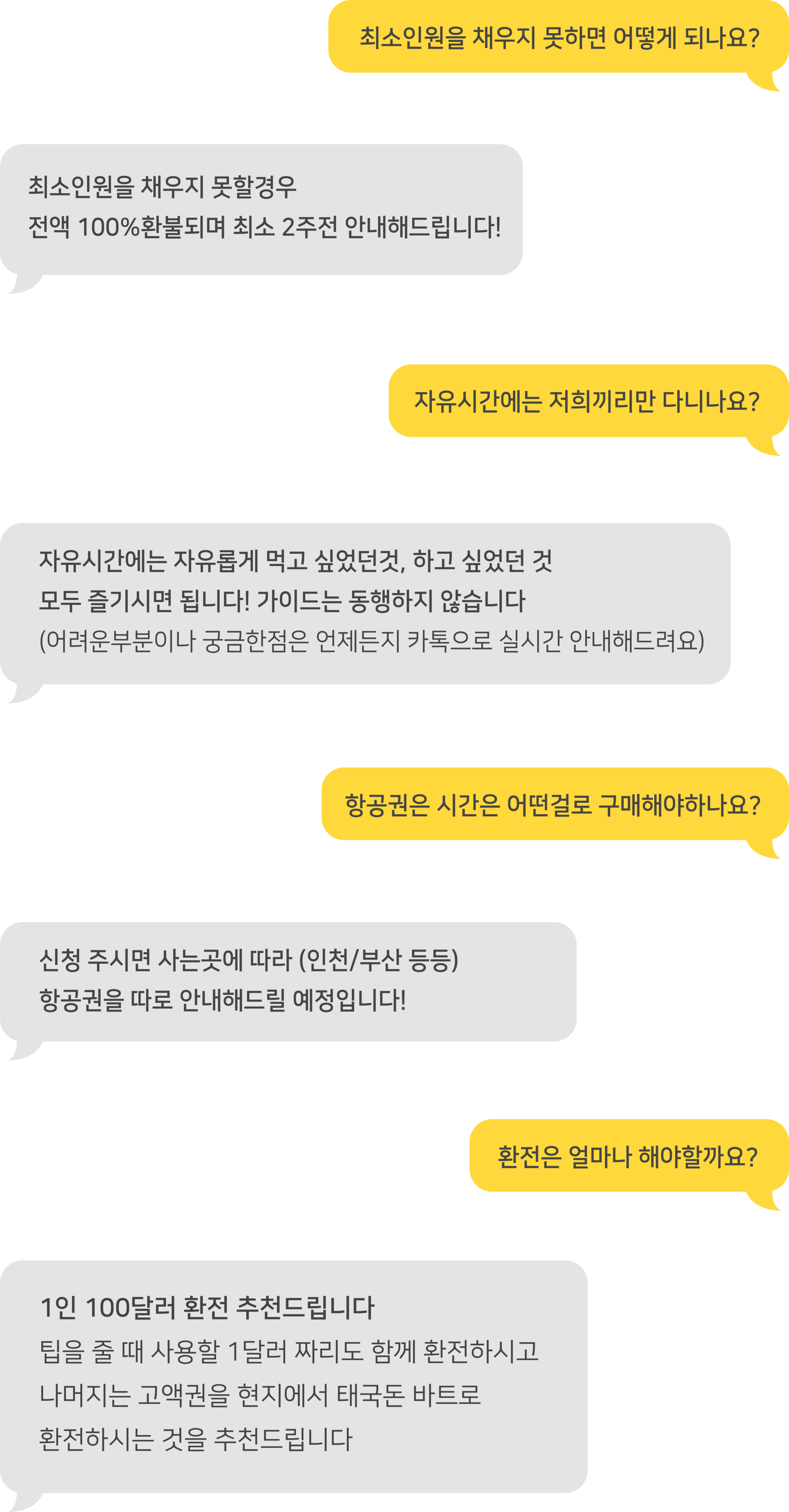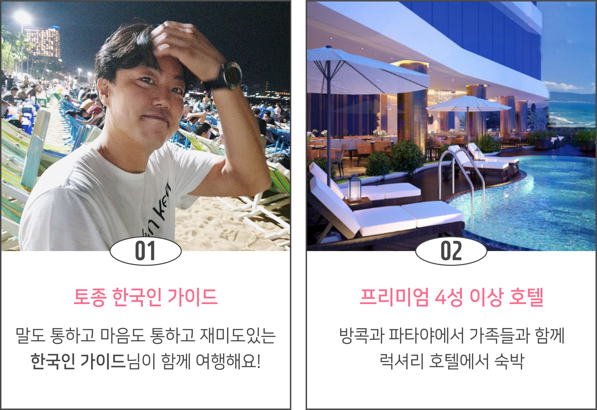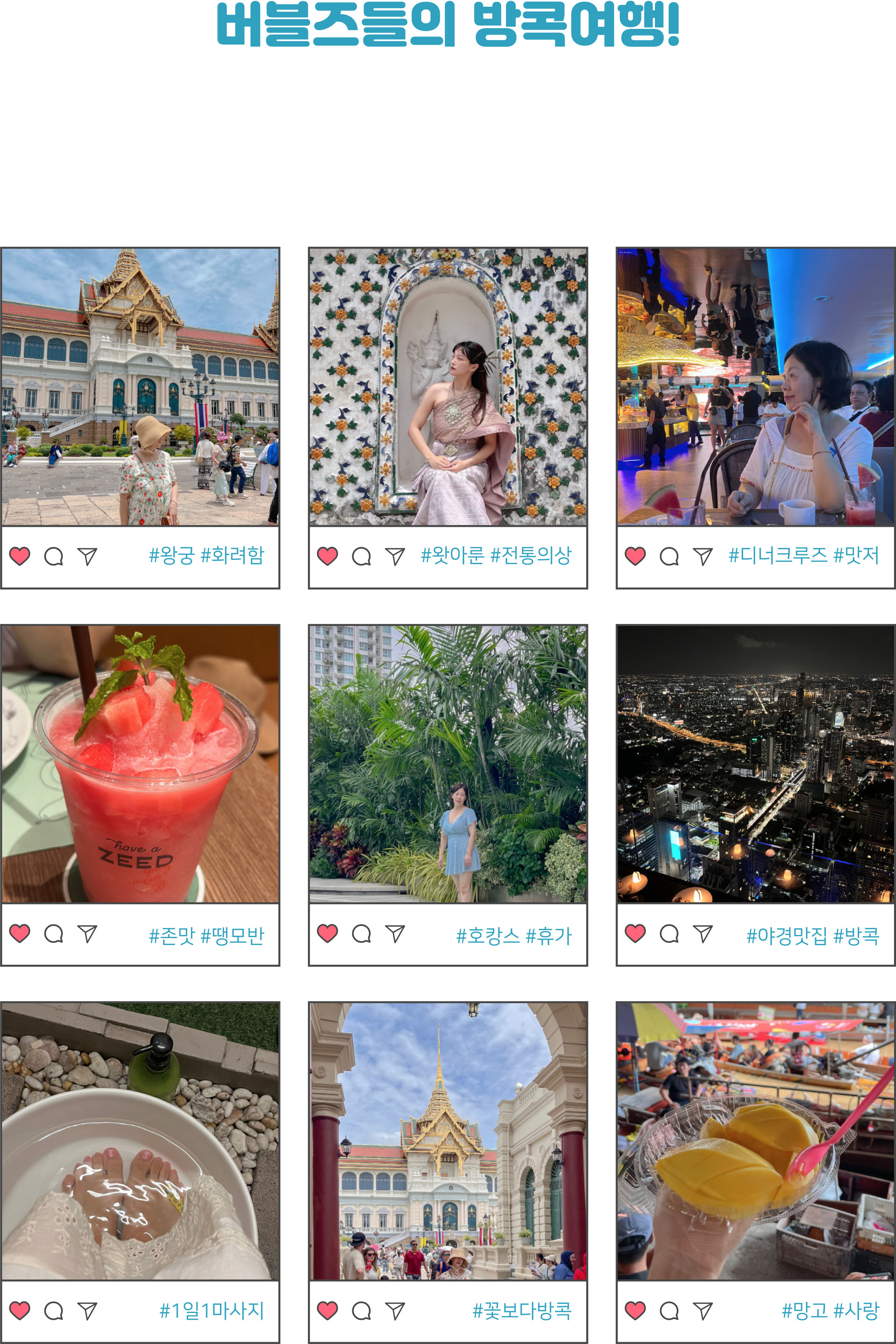 여행코스 | 방콕(1박) ▷ 파타야(2박) 왕궁, 수상마을, 진리의성전, 마사지, 티파니쇼, 야시장, 니모섬 투어, 파타야시티투어, 눙눅빌리지, 아시아티크 등 * 다른 일정으로 단독투어를 원하시는 분들은 카톡문의 |