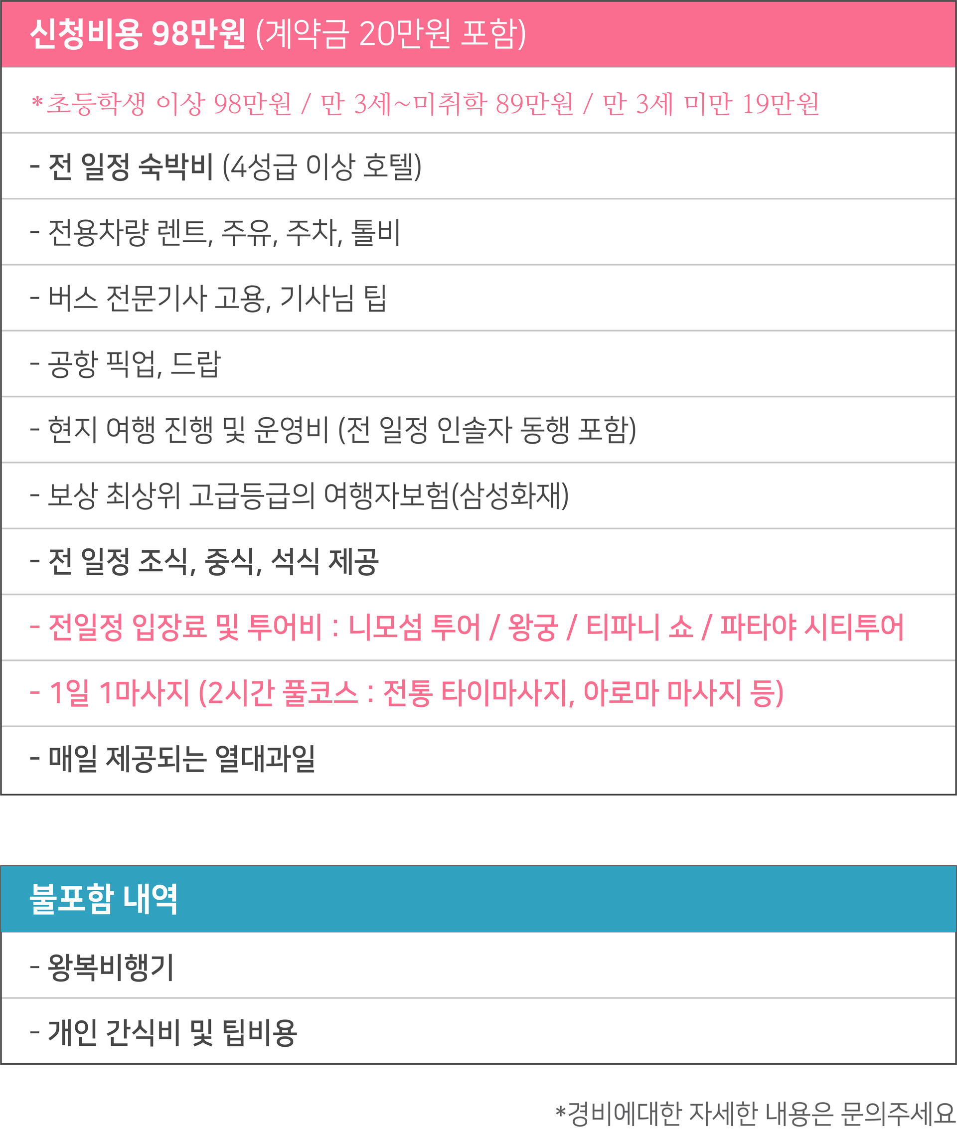 신청비용 (포함/불포함) | 신청비용 : 98만원 (계약금 20만원 포함) * 초등학생 이상 98만원, 만 3세~ 미취학 89만원, 만 3세 미만 19만원 불포함 : 왕복 항공권 / 간식비, 매너팁 등 |