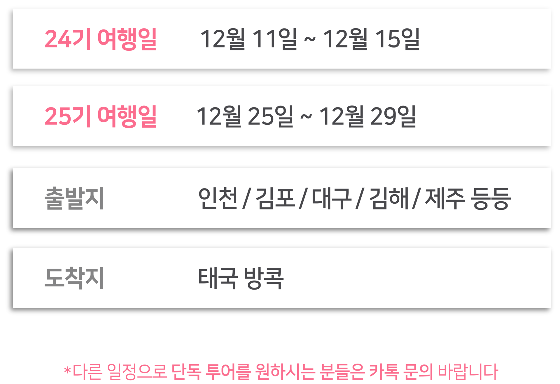 여행일정 | 24기 12/11(목)~12/15(월) 3박 5일 25기 12/25(목)~12/29(월) 3박 5일 |
