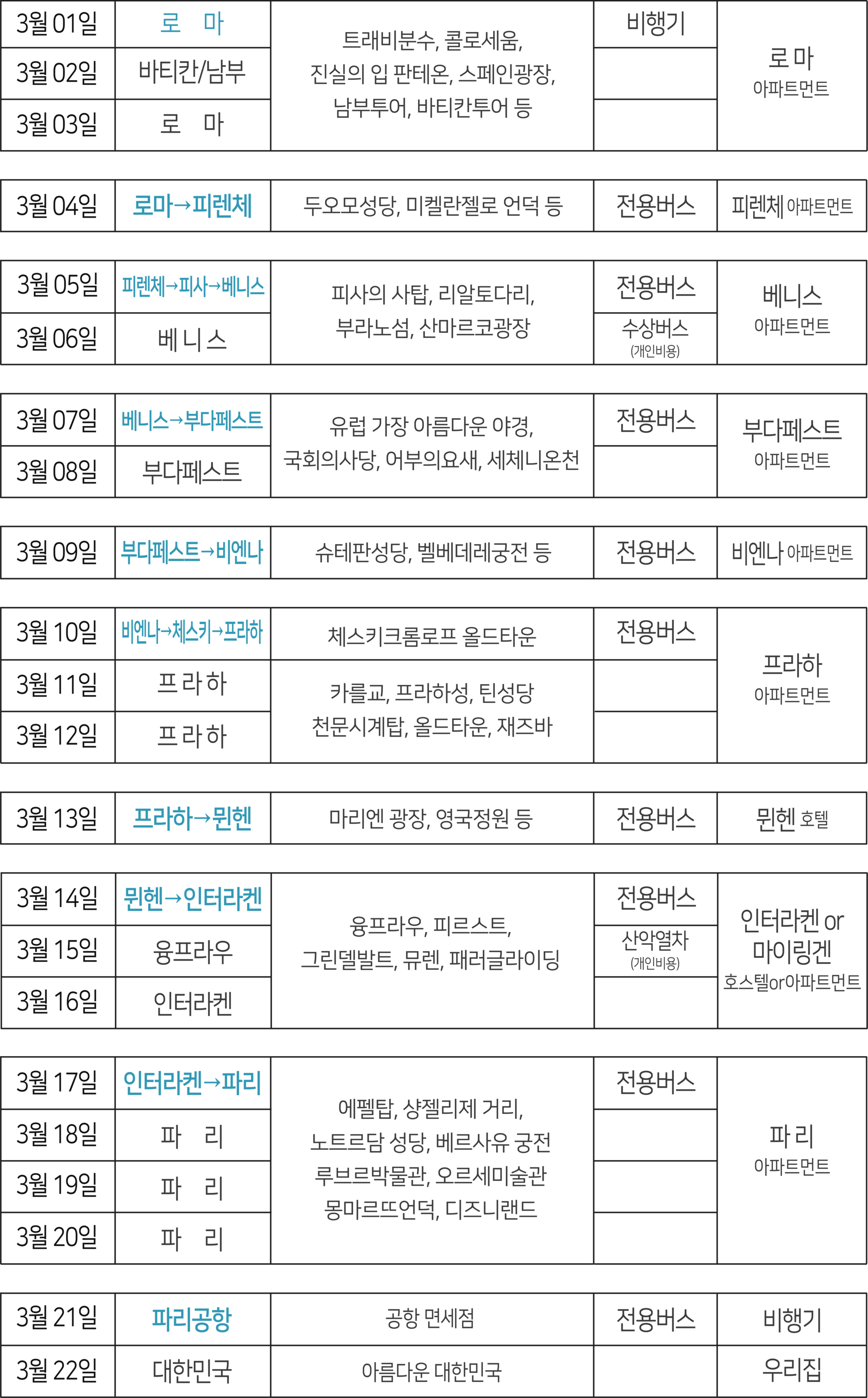 또한 패키지여행처럼 도시이동은 버스로 안전하고 편하게,