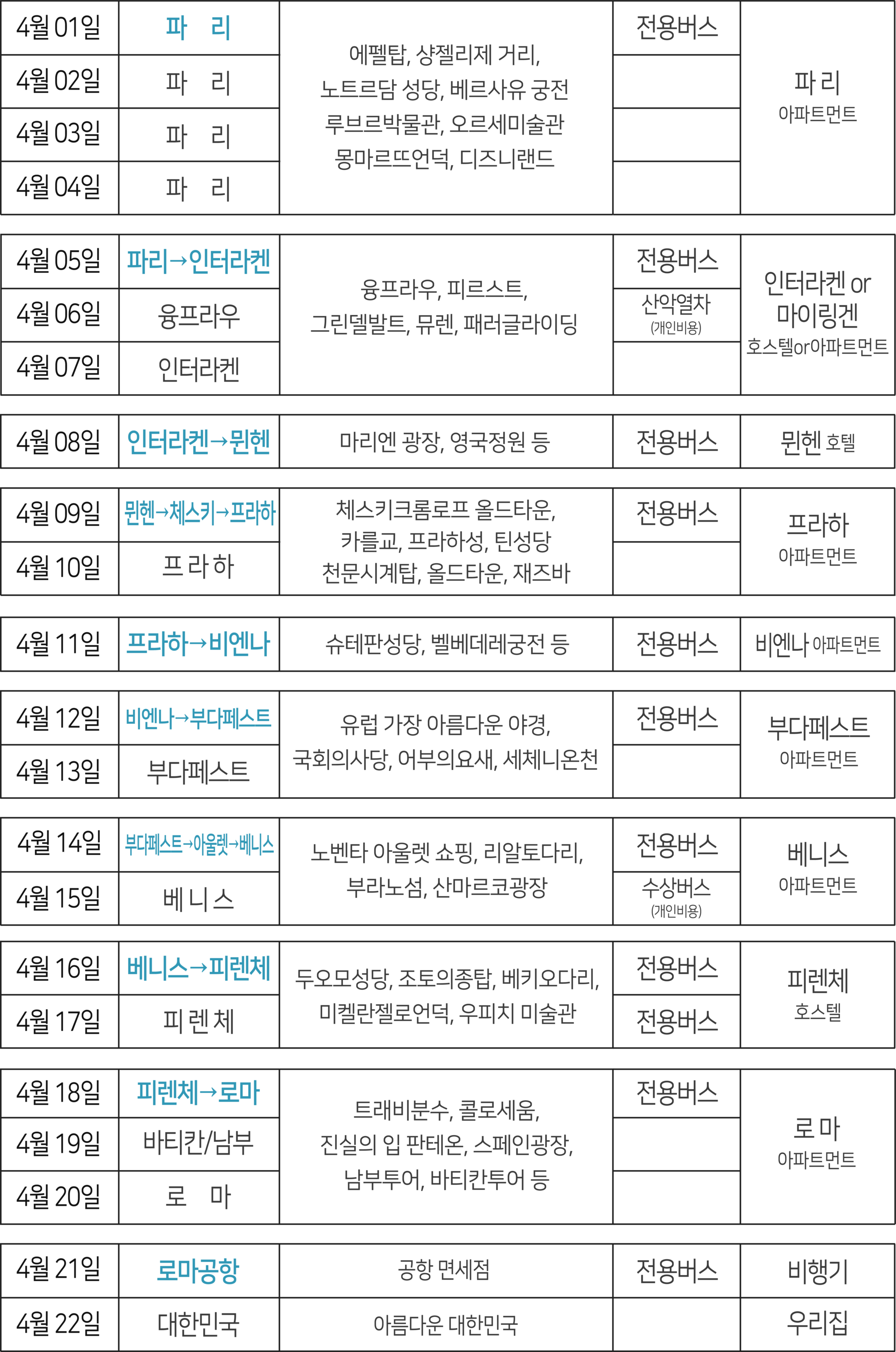 또한 패키지여행처럼 도시이동은 버스로 안전하고 편하게,