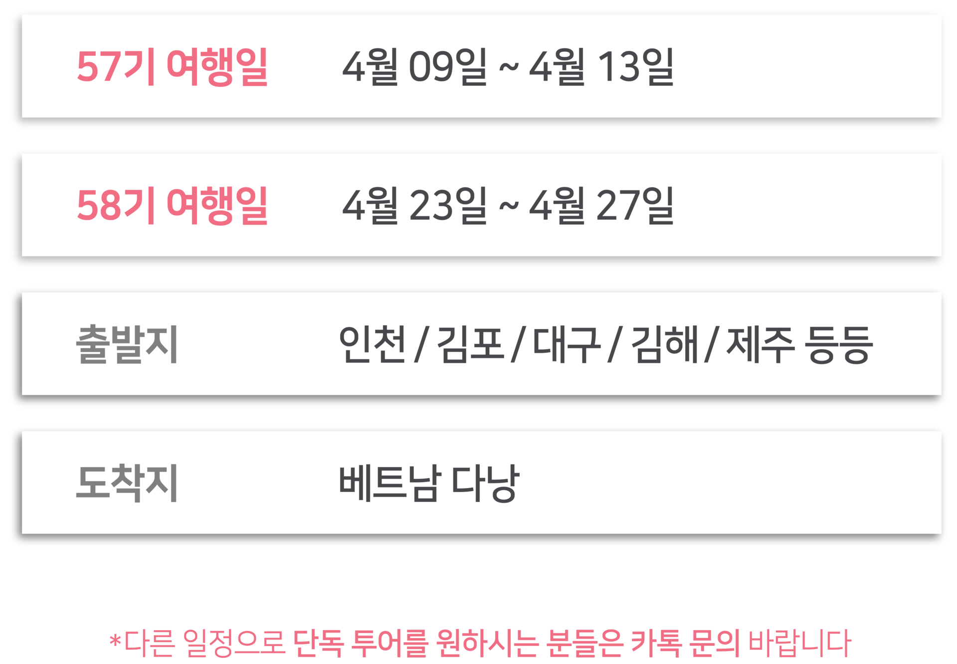여행일정 | 57기 4/09(목)~4/13(월) 58기 4/23(목)~4/27(월) / 총 3박 5일 |