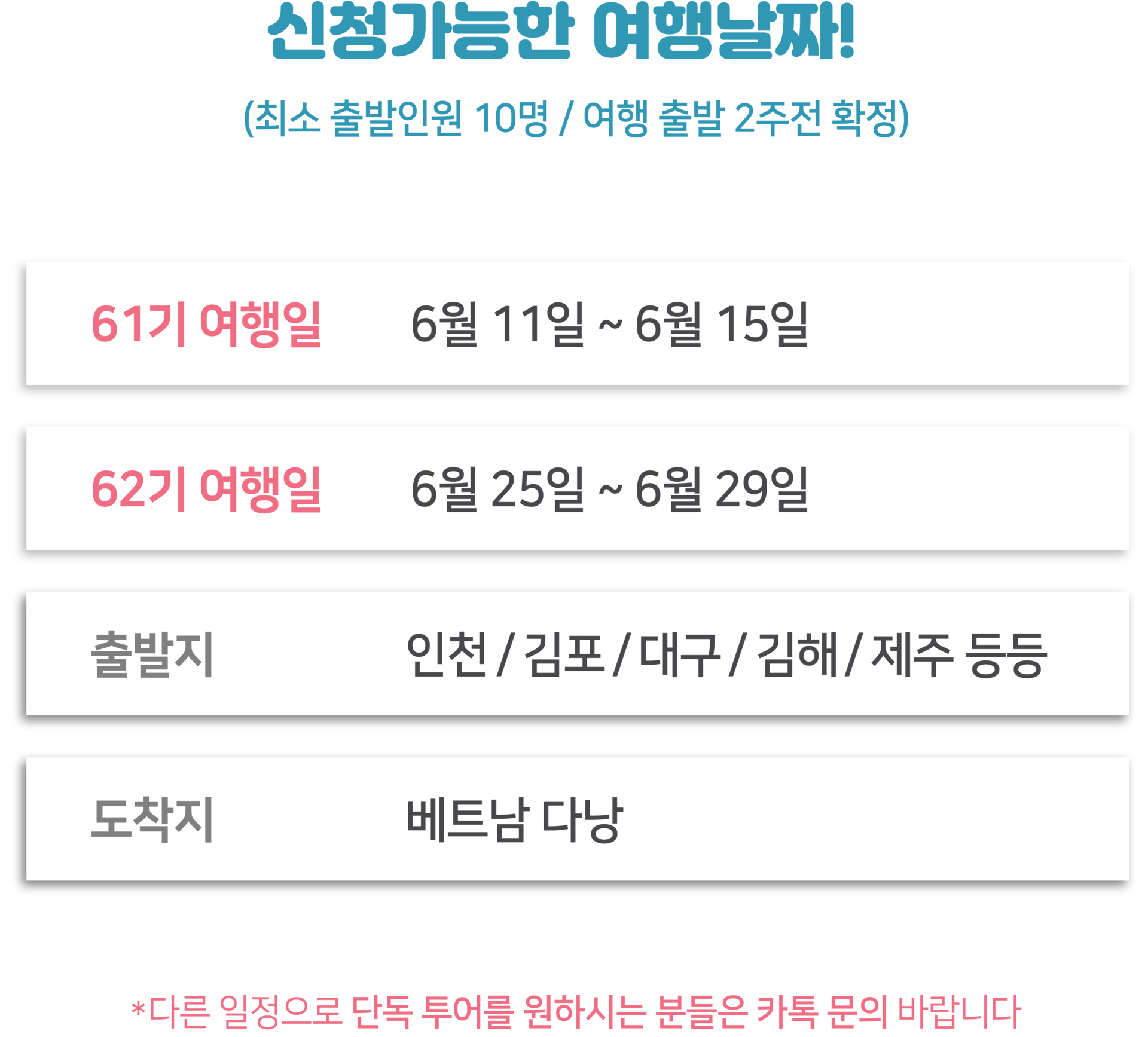 여행일정 | 61기 6/11(목)~6/15(월) 62기 6/25(목)~6/29(월) / 총 3박 5일 |