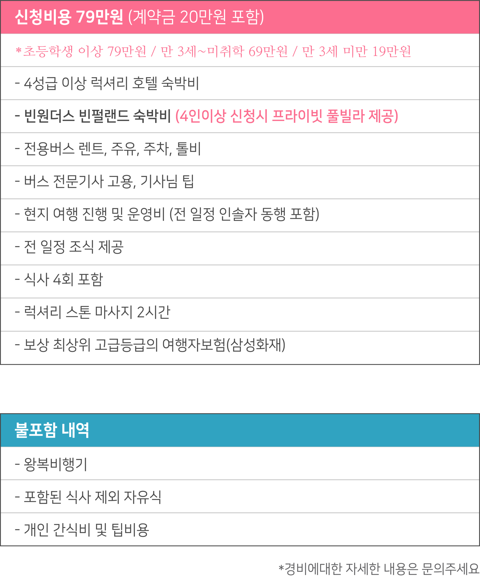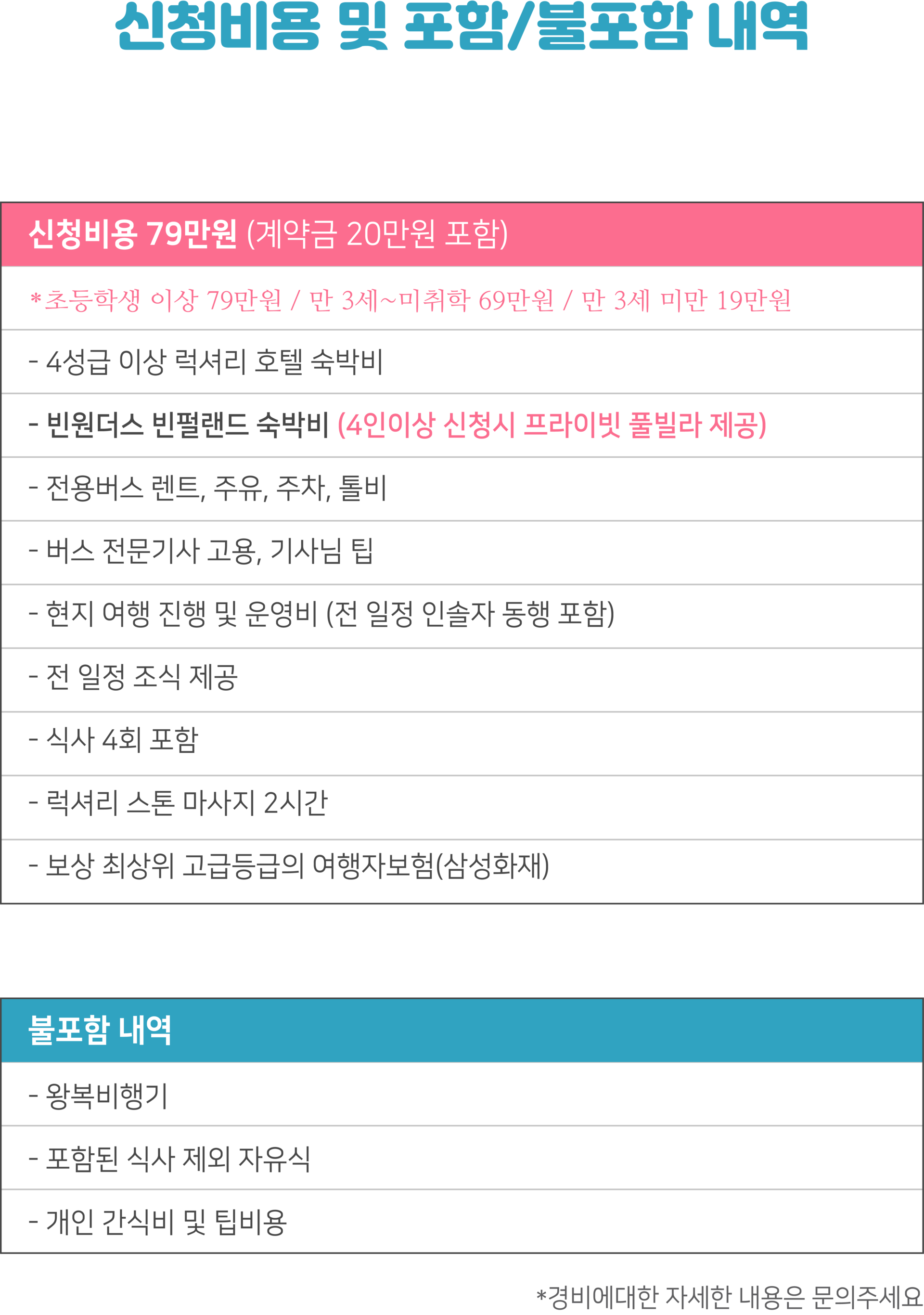신청비용 (포함/불포함) | 신청비용 : 79만원 (계약금 20만원 포함) * 초등학생 이상 79만원, 만 3세~ 미취학 69만원, 만 3세 미만 19만원 불포함 : 왕복 항공권 / 중식 2회, 석식 2회, 매너팁 등 |