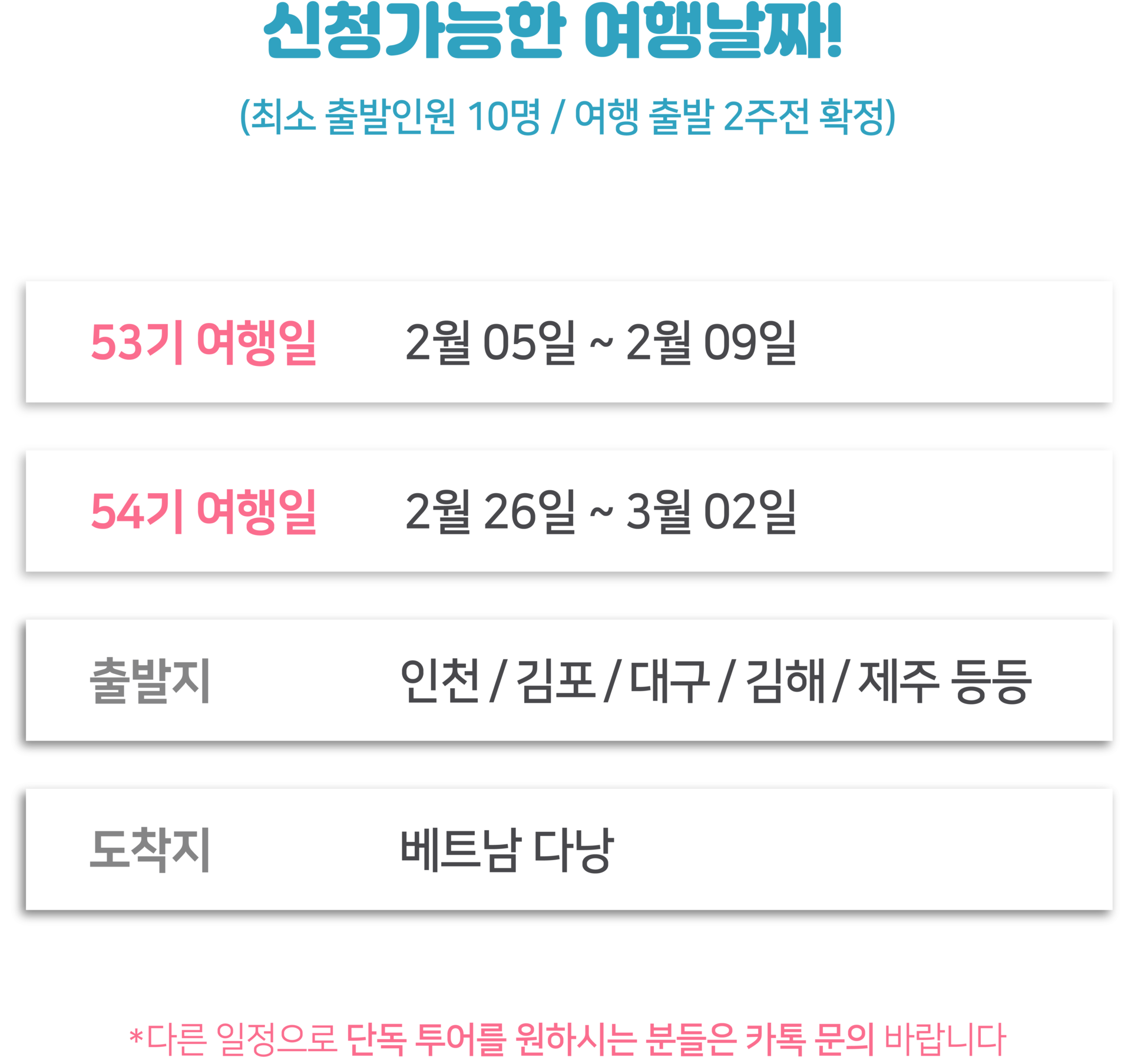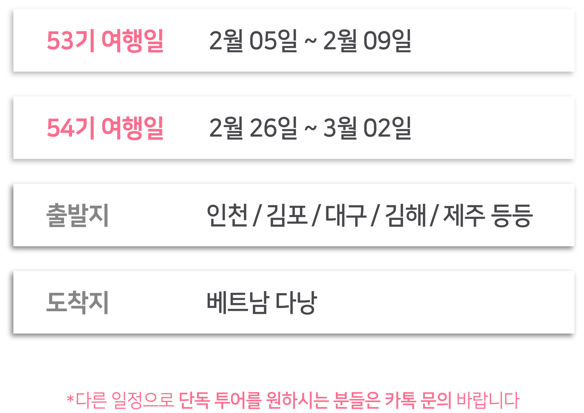 여행일정 | 53기 2/05(목)~2/09(월) 54기 2/26(목)~3/02(월) 출발확정 / 총 3박 5일 |